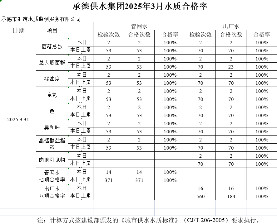 承德供水集團(tuán)2025年3月31日水質(zhì)合格率